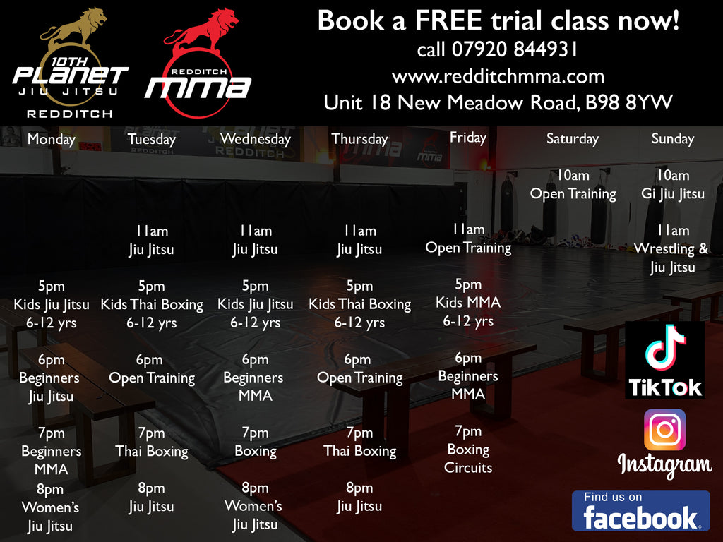 You can call or text 07920 844931 and book a class, you can also book by sending a message to the email info@redditchmma.com or via our instagram or facebook page. that's where our most recent content is posted.